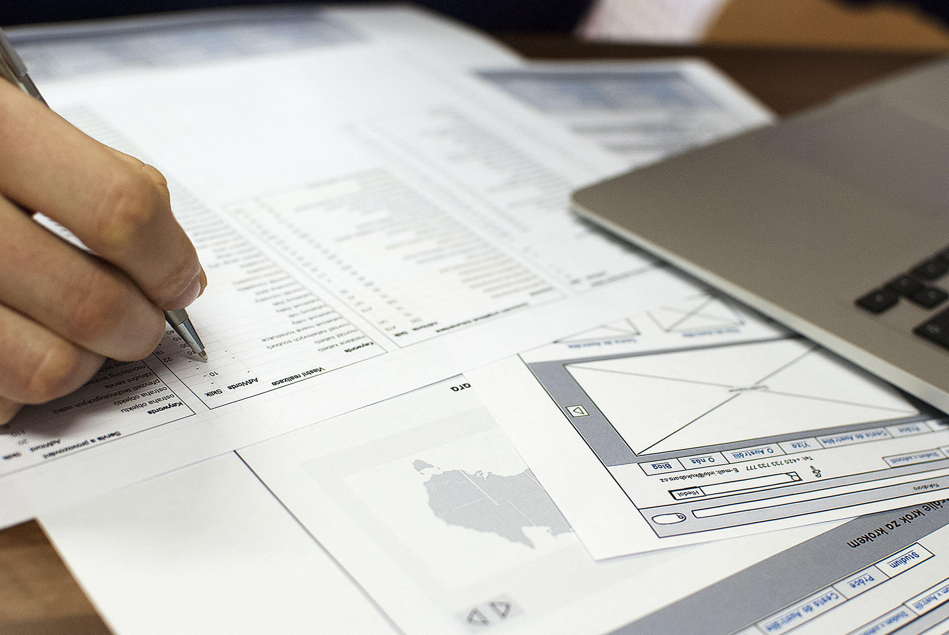 Jakmile si odsouhlasíme klíčová slova, pustíme se do návrhu struktury web a následné tvorby wireframů (zjednodušené architektury webu), kde klademe důraz na jednoduchost, přehlednost, postupné sdělování informací dle důležitosti a konverzní tlačítka, kterými zákazníka navádíme do potřebných sekcí webu.